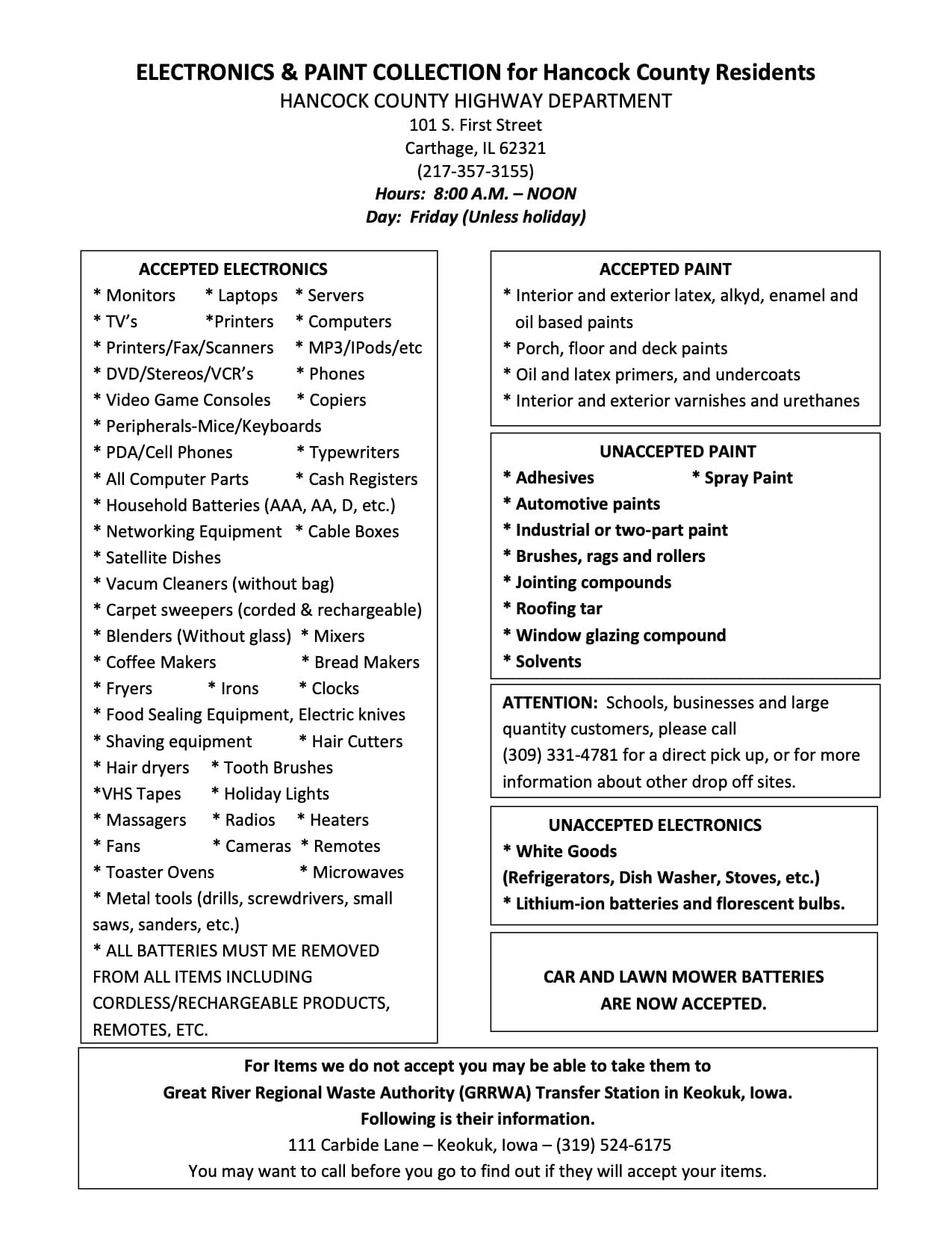 Office of the County Engineer Elgin Berry 217-357-3155 engineer@hancockcounty-il.gov Electronics, Paint Collection – Recycling Learn More County Engineer Home Documents and Forms Frequently Asked Questions Electronics, Paint Collection and Recycling Illinois Department of Transportation Road Conditions Road Commissioners Learn More County Engineer Home Documents and Forms Frequently Asked Questions Electronics, Paint Collection and Recycling Illinois Department of Transportation Road Conditions Road Commissioners